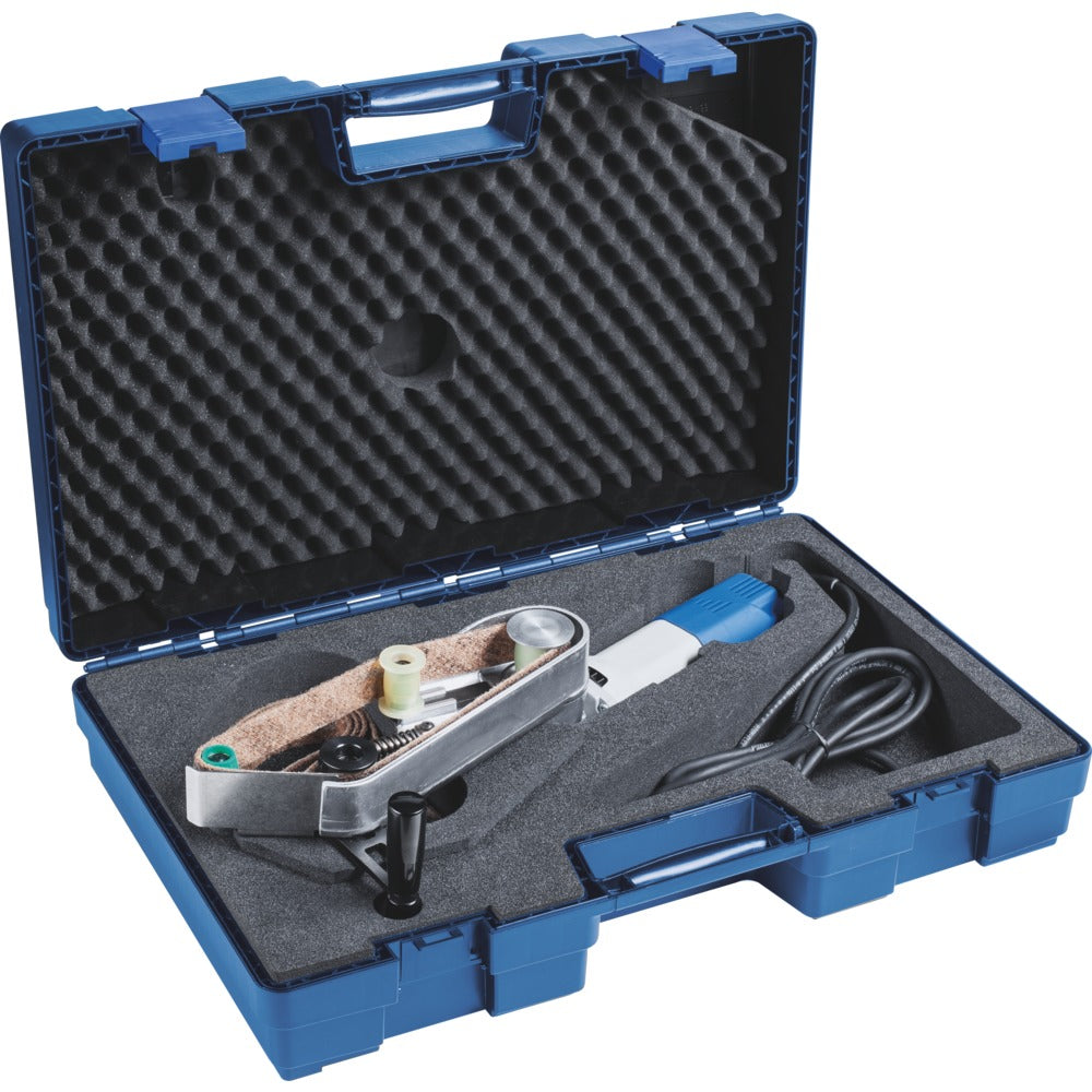 Prestanda: Steglös varvtalsreglering. Digital elektronik för konstanta varvtal. Överbelastningsskydd. Återstartsskydd vid spänningsfall (USP). Mjuk start som skydd för användaren, verktyget och maskinen. Justerbar bandstyrningsrulle för anpassning till rördiametrar upp till 70 mm. Kontaktvinkel på arbetsstycket till maximalt 220 grader är möjlig. UBS 11/90 SI-R TK Rörbandslipmaskin i väska. Ingår: 3 m nätkabel, 1 st spännyckel.