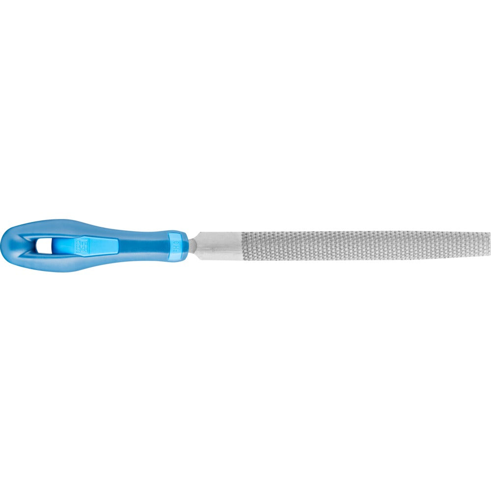 Halvrund fil, avsmalnande form, med rasphuggning på två sidor. Form C enligt DIN 7263. Med tånge.